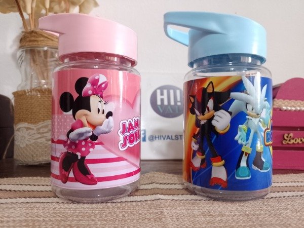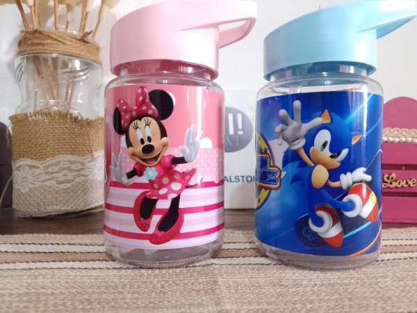 Botella plástica chica con pico y sorbete personalizada con vinilo